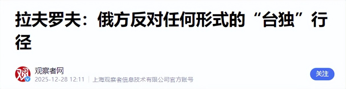 在解放军围绕台湾省展开大规模演训的节点前一天,12月28日俄外长拉夫罗夫直接表态,若台海爆发冲突,俄罗斯将坚定支持中国实现国家统一。